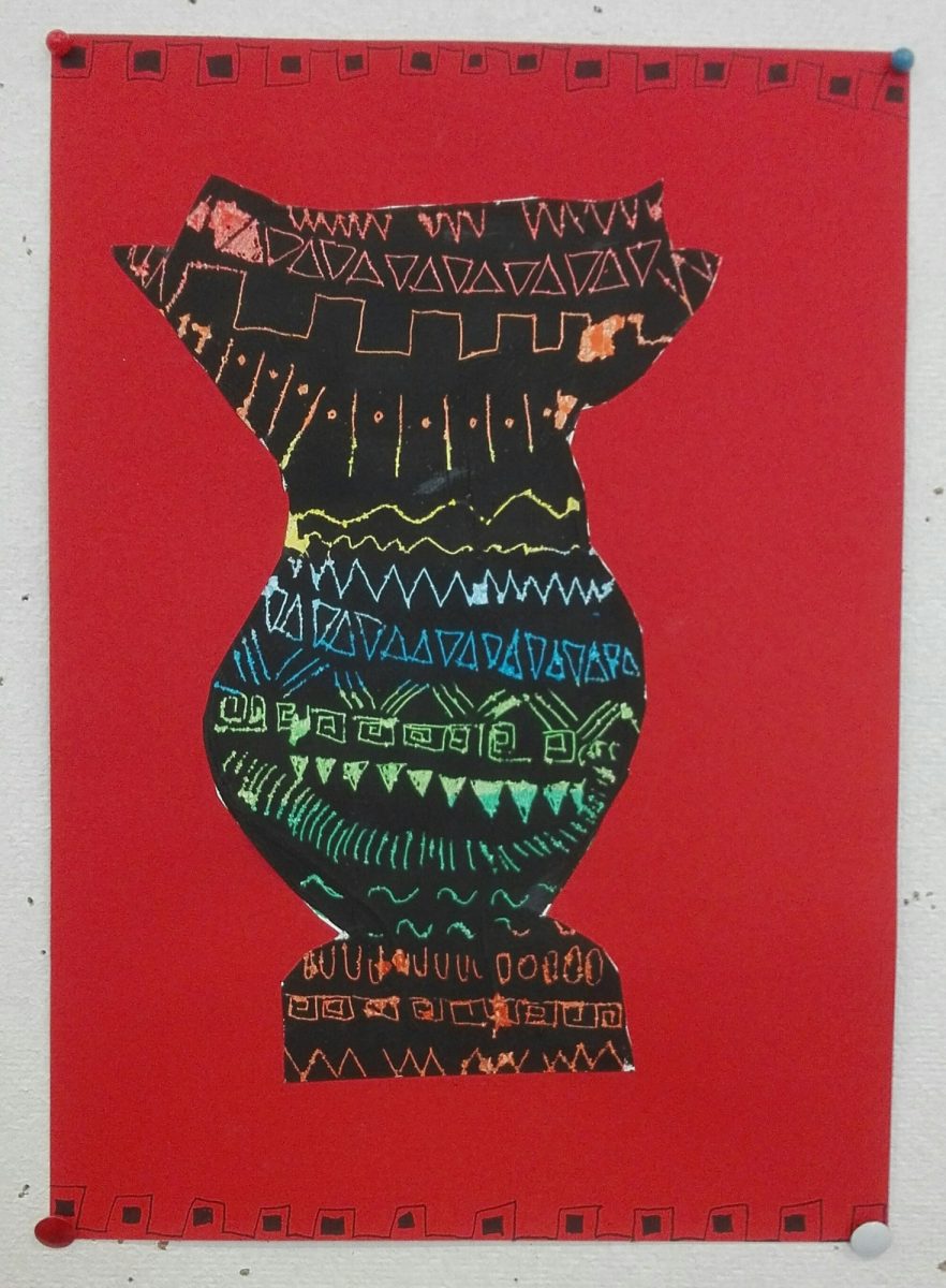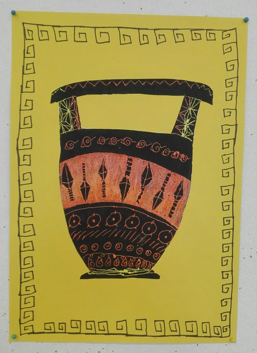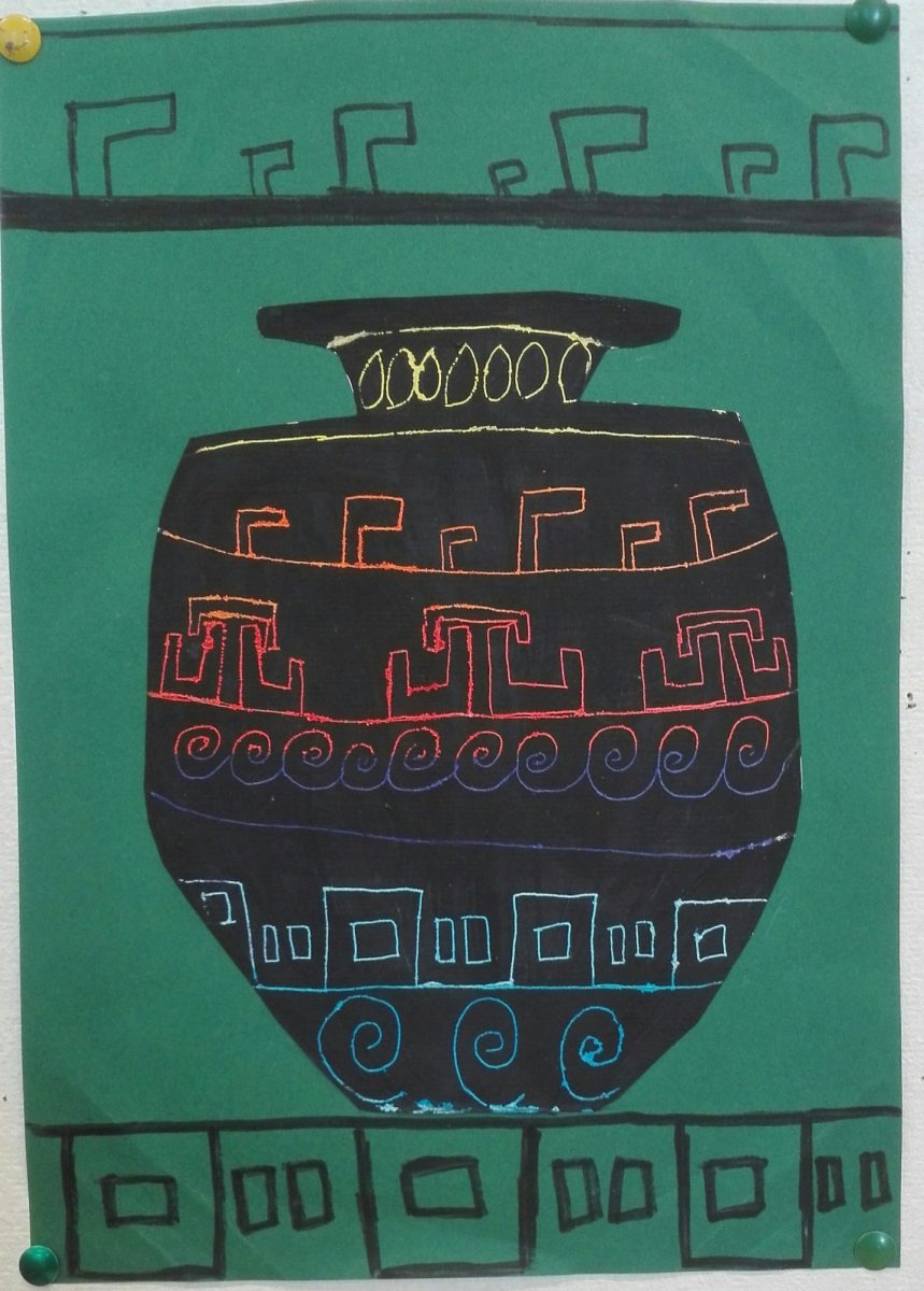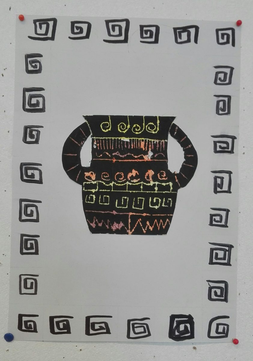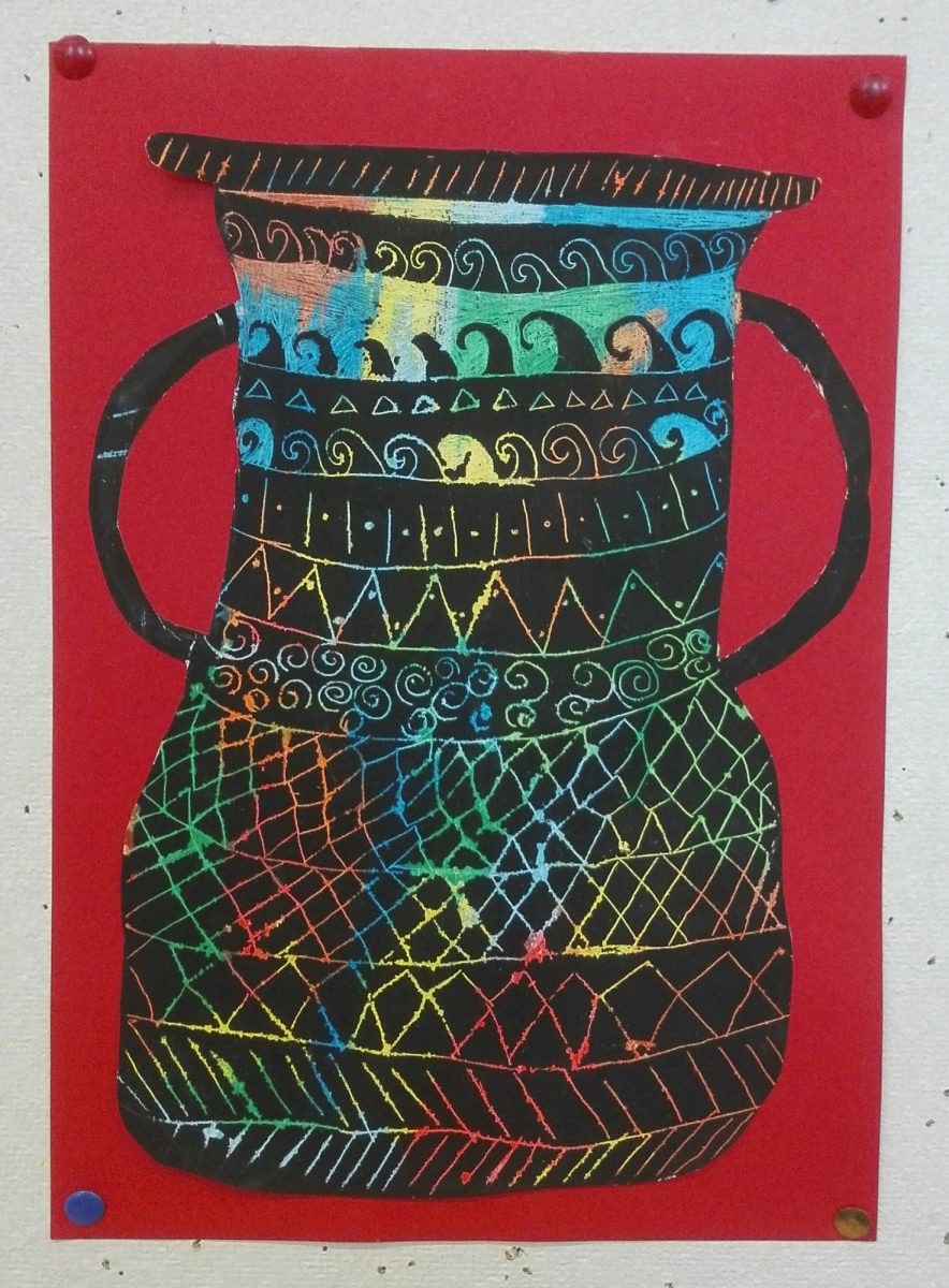 Aus Ölkreiden entstanden in der 2b-Klasse antike Vasen nach griechischem Vorbild. Diese wurden danach mit schwarzer Acrylfarbe übermalt. Während der Trockenzeit überlegten sich die SchülerInnen griechische Muster und übten diese auf einem Schmierzettel. Dann wurden diese mit feinen Stäbchen in die Vasen geritzt.