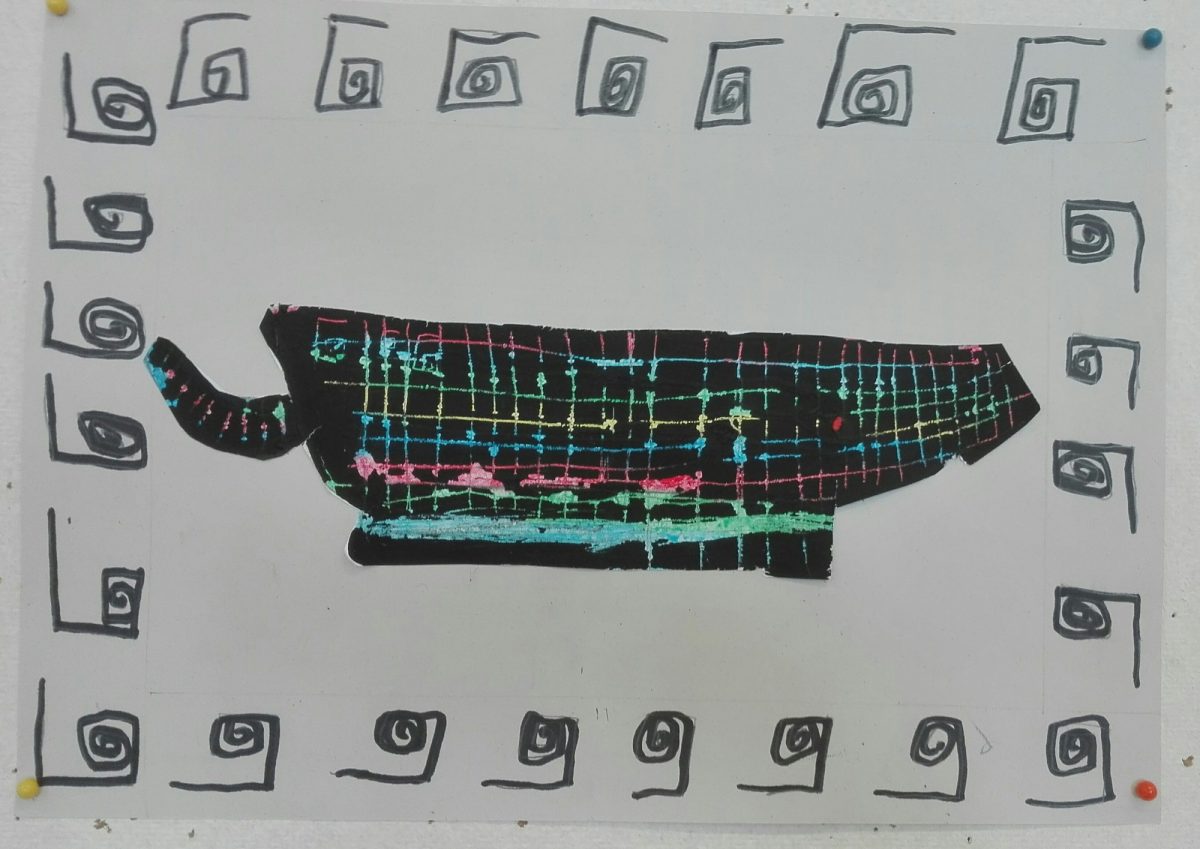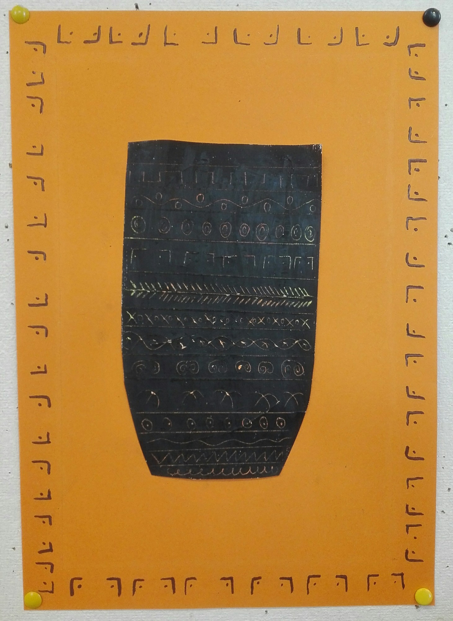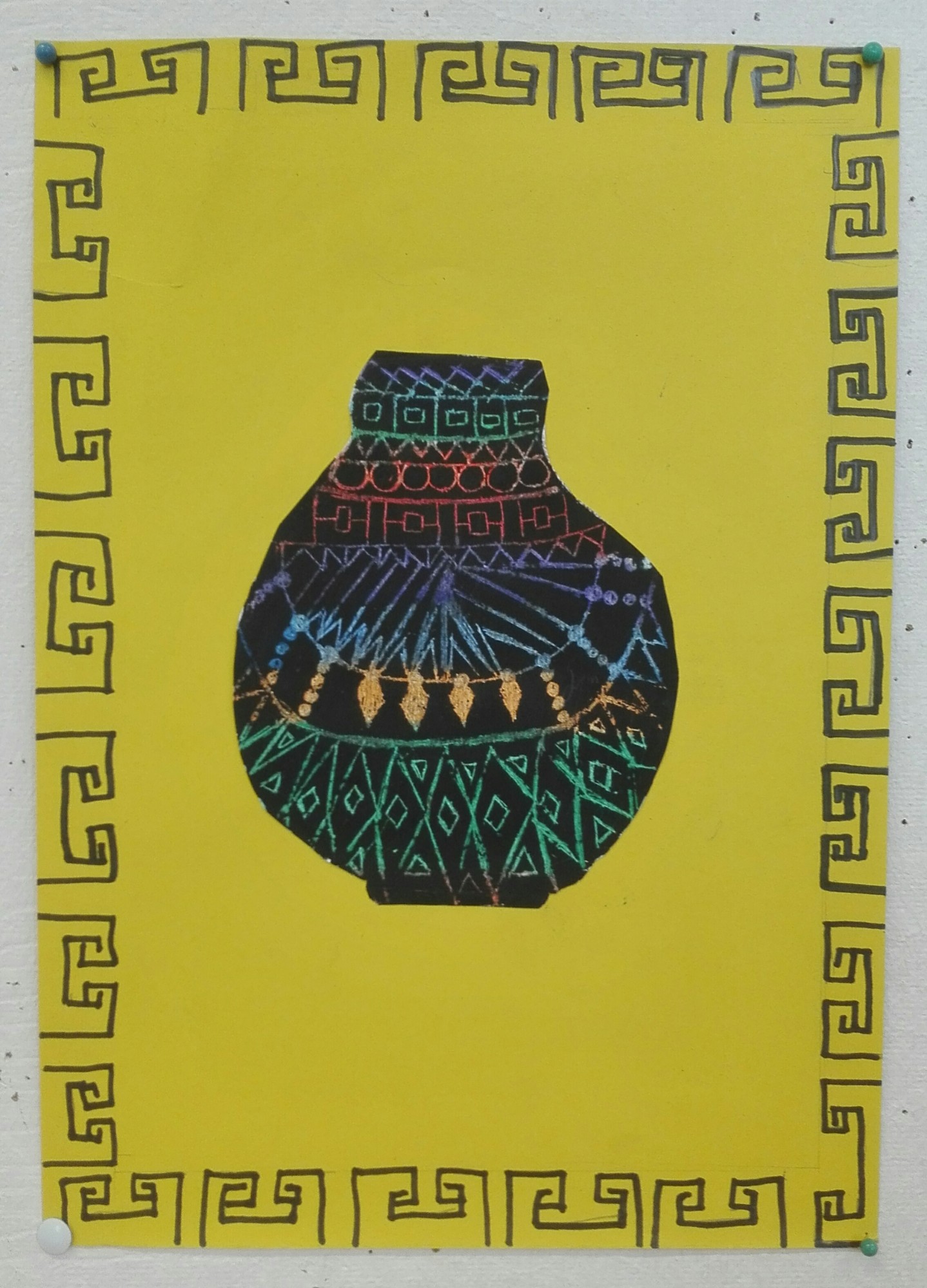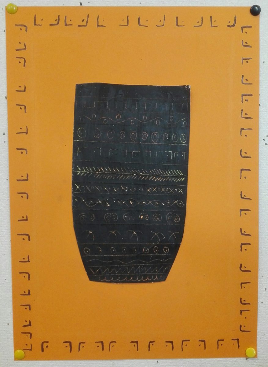 Aus Ölkreiden entstanden in der 2b-Klasse antike Vasen nach griechischem Vorbild. Diese wurden danach mit schwarzer Acrylfarbe übermalt. Während der Trockenzeit überlegten sich die SchülerInnen griechische Muster und übten diese auf einem Schmierzettel. Dann wurden diese mit feinen Stäbchen in die Vasen geritzt.