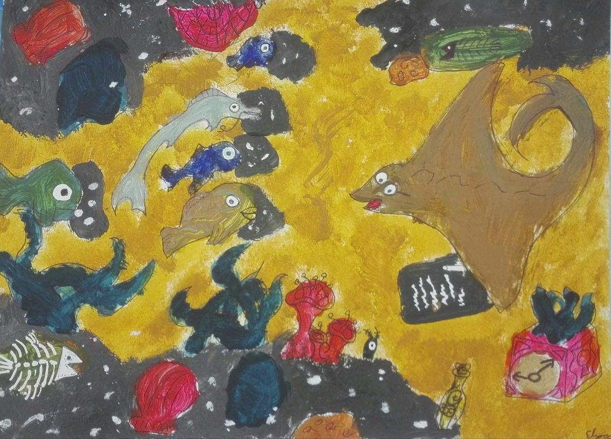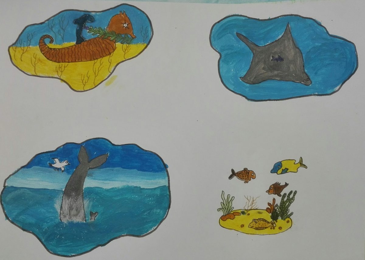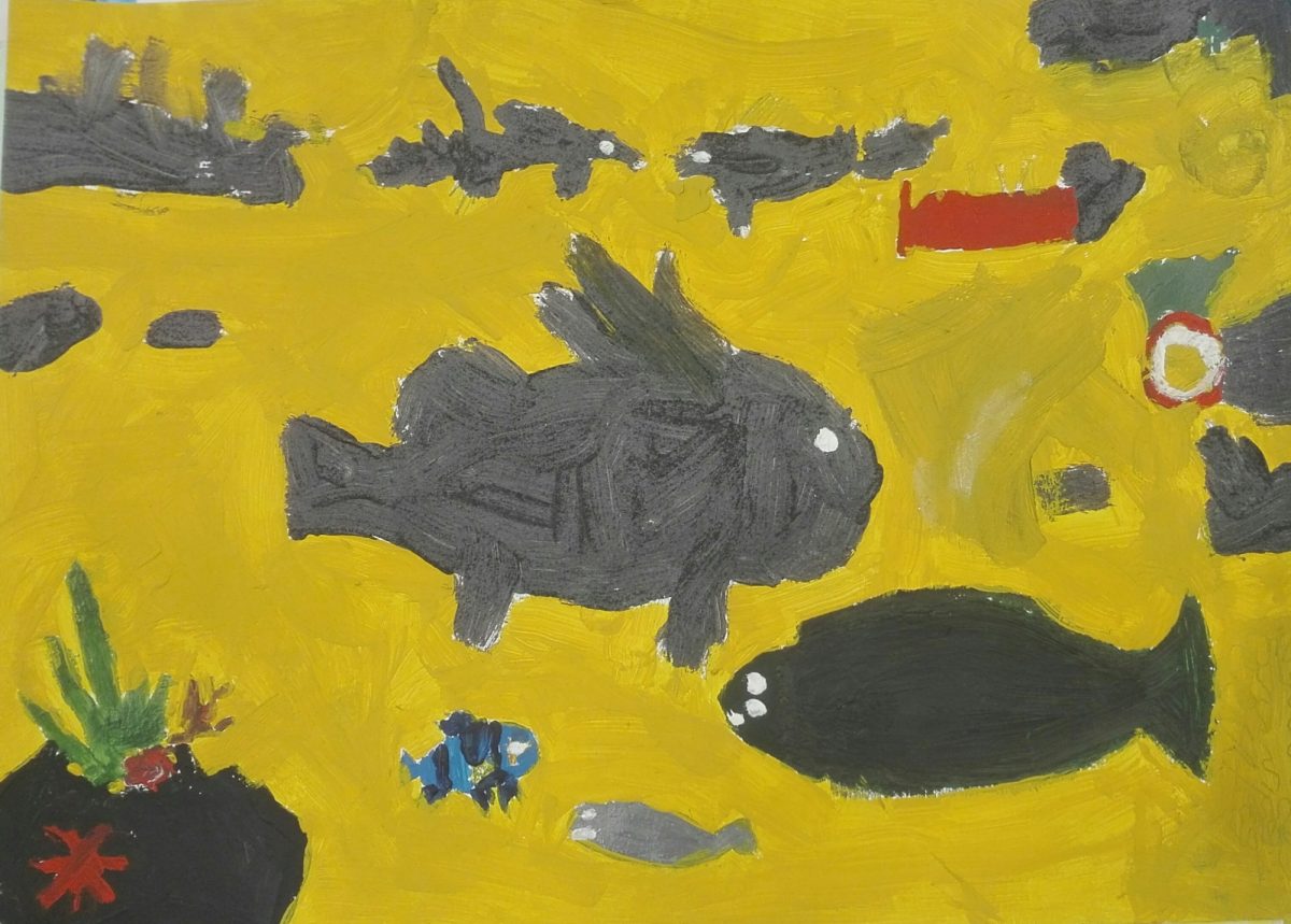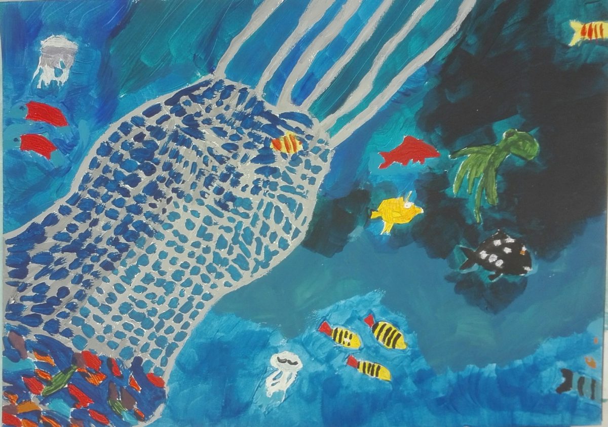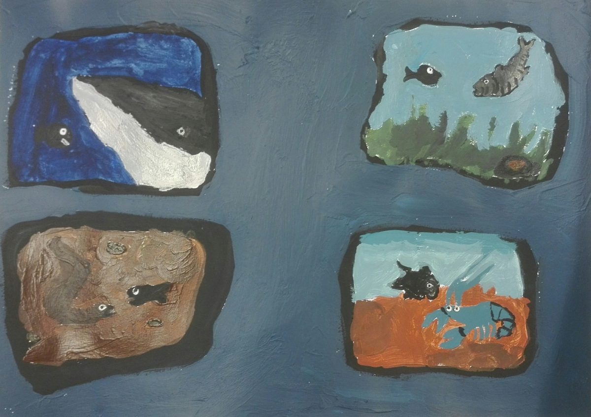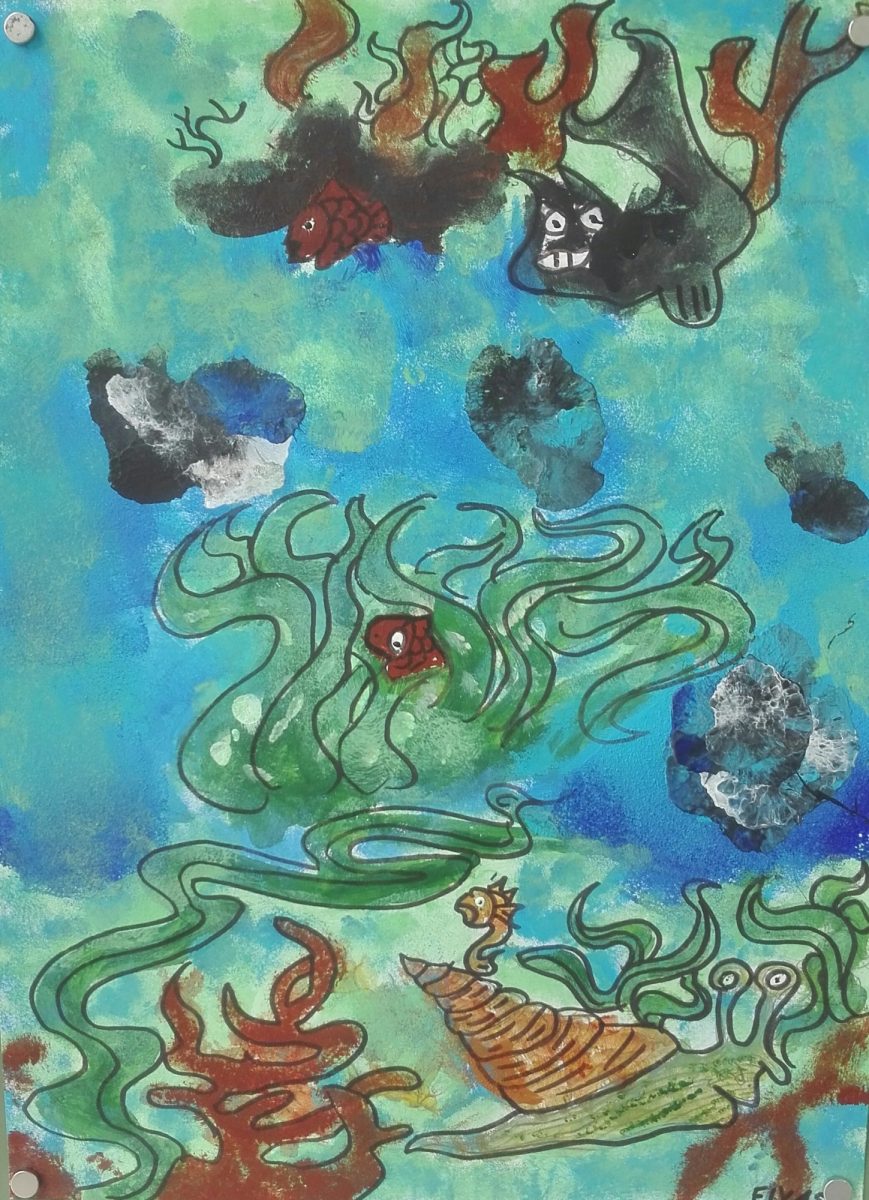 Ein ganz besonderes Projekt nahmen die Schülerinnen und Schüler der 2b in Angriff. Sie illustrierten die Geschichte vom Flunkerfisch (Axel Scheffler und Julia Donaldson). Verwendet wurden Acrylfarben.