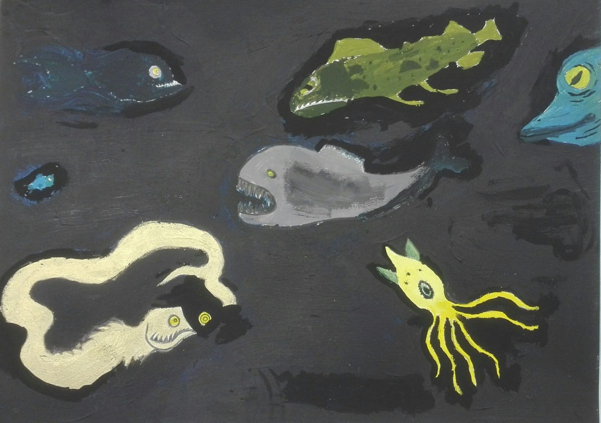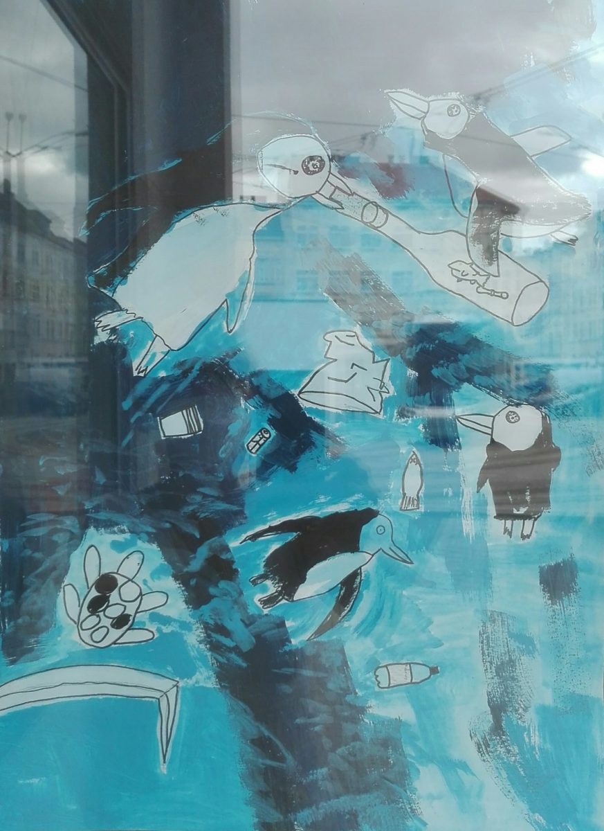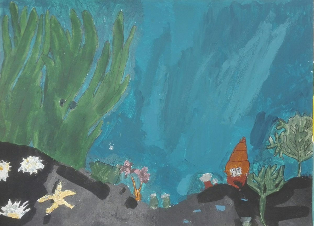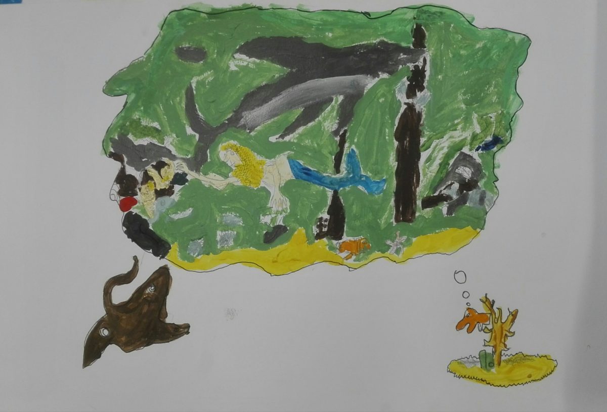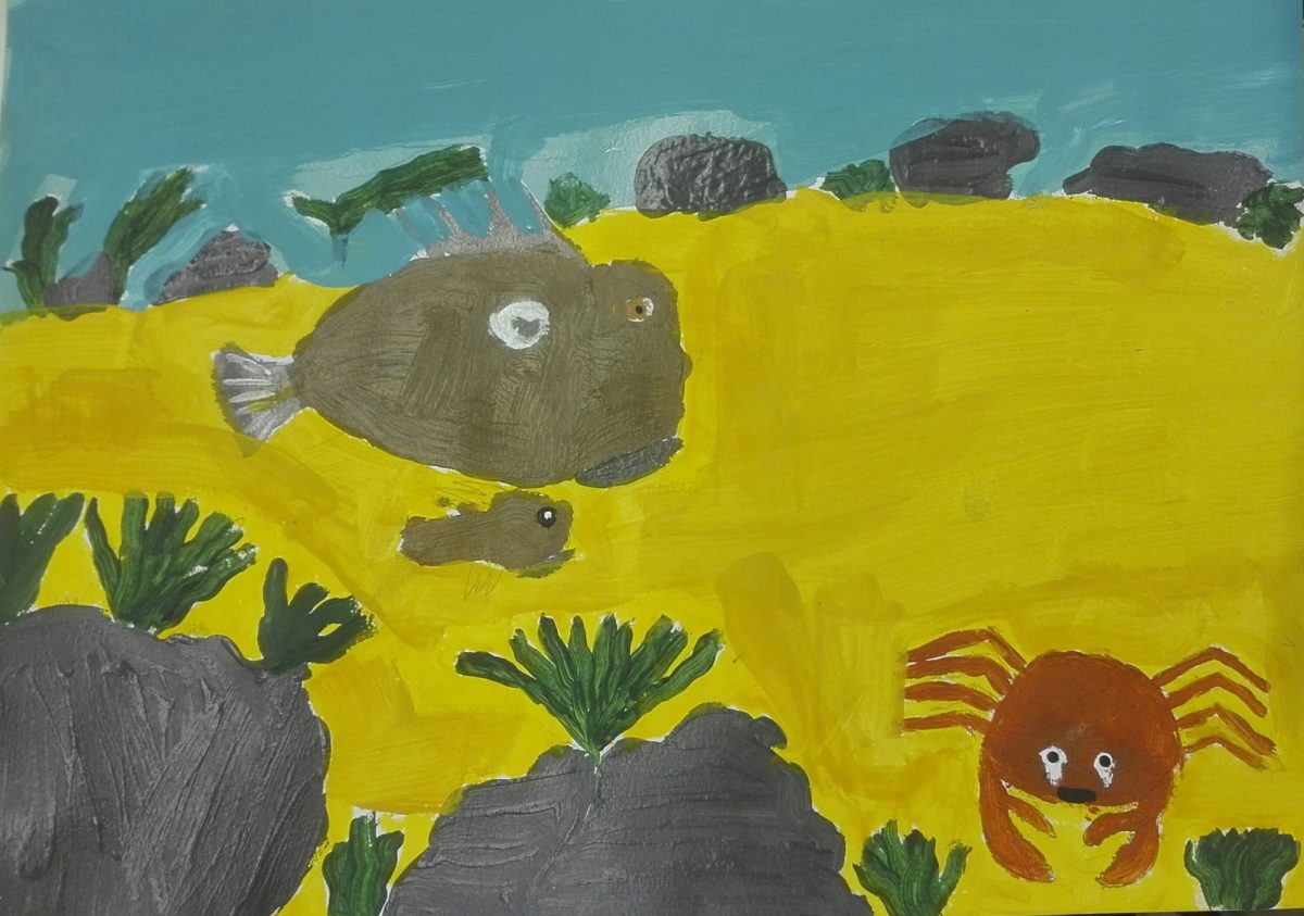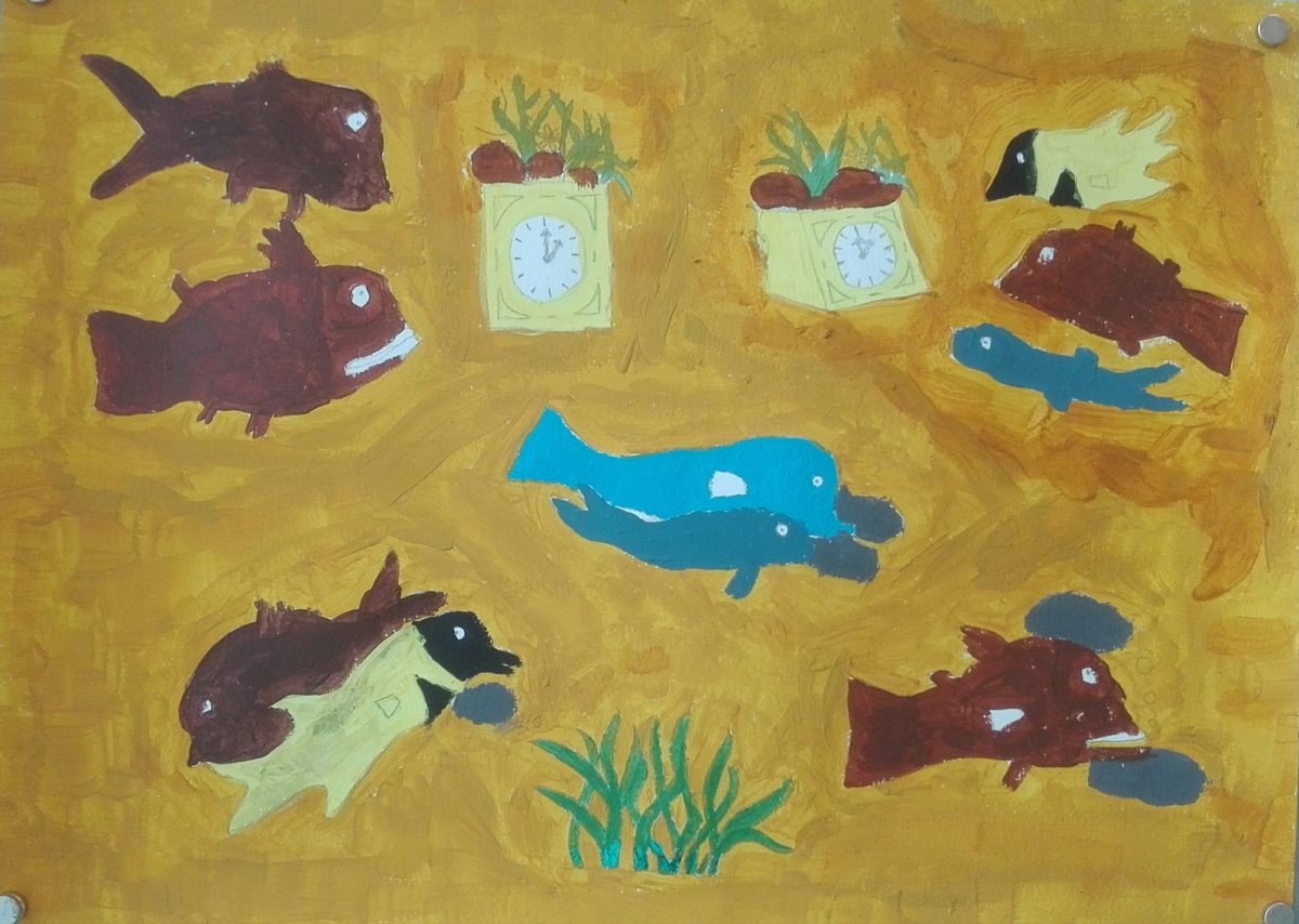 Ein ganz besonderes Projekt nahmen die Schülerinnen und Schüler der 2b in Angriff. Sie illustrierten die Geschichte vom Flunkerfisch (Axel Scheffler und Julia Donaldson). Verwendet wurden Acrylfarben.