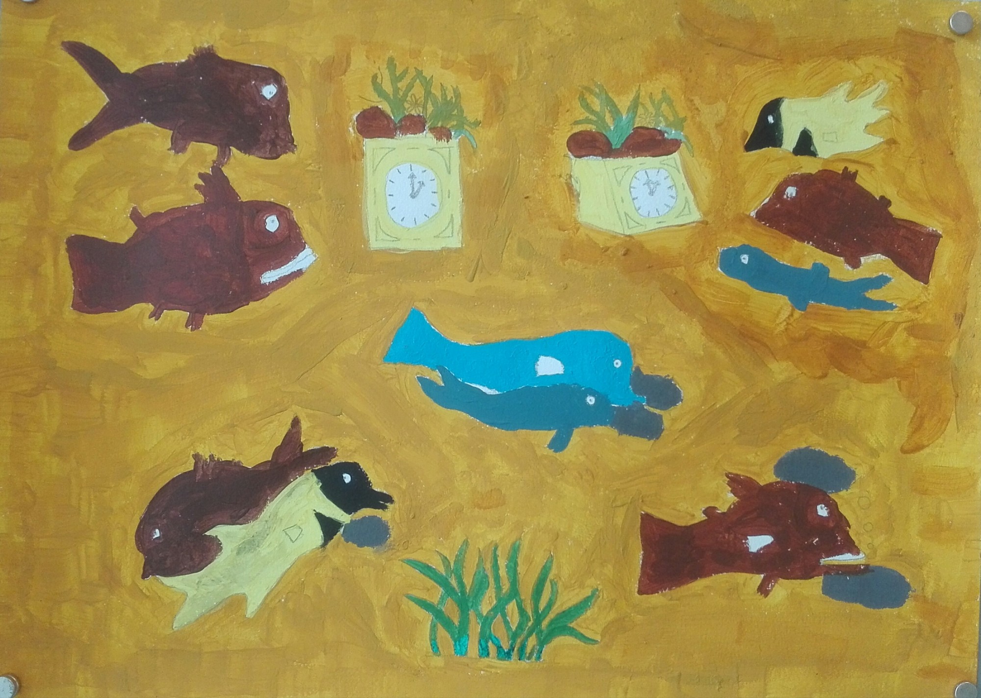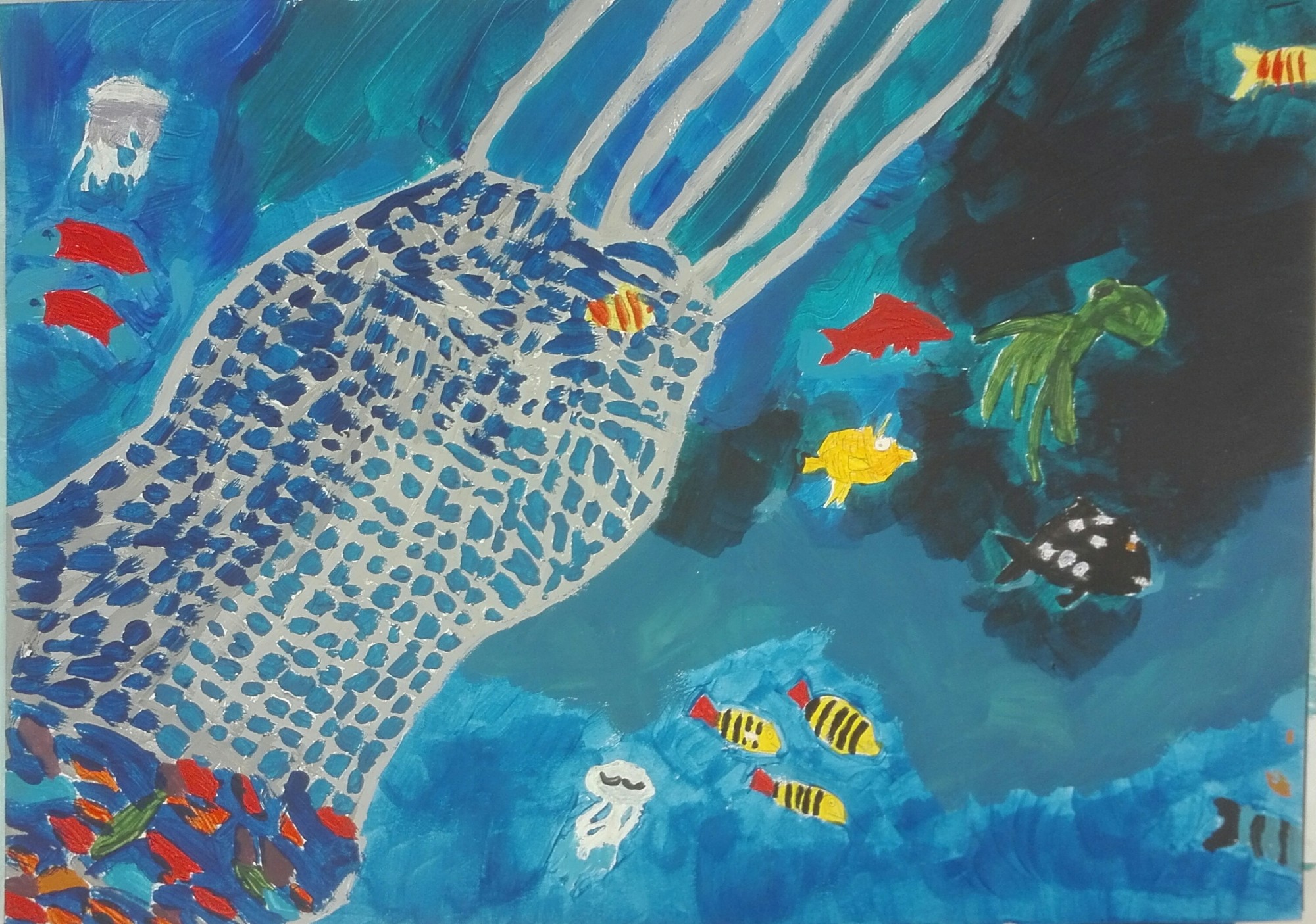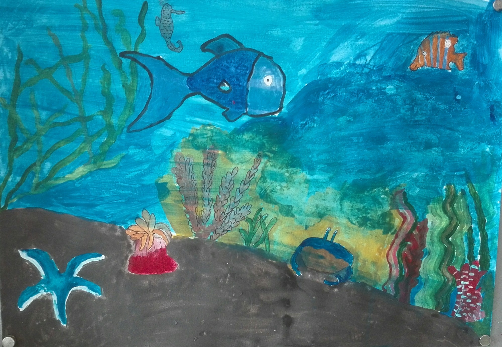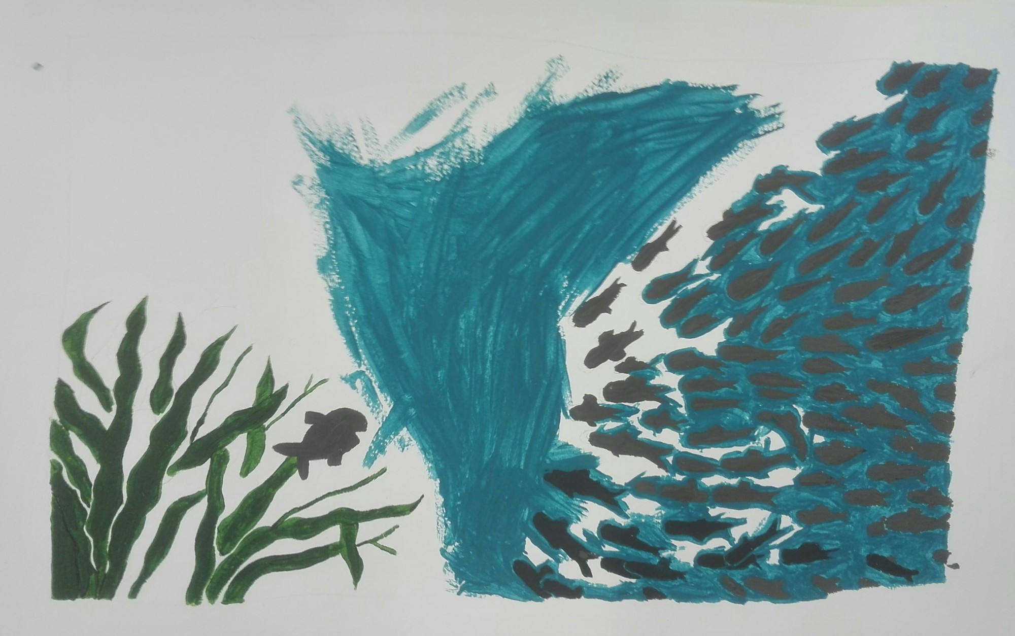 Ein ganz besonderes Projekt nahmen die Schülerinnen und Schüler der 2b in Angriff. Sie illustrierten die Geschichte vom Flunkerfisch (Axel Scheffler und Julia Donaldson). Verwendet wurden Acrylfarben.