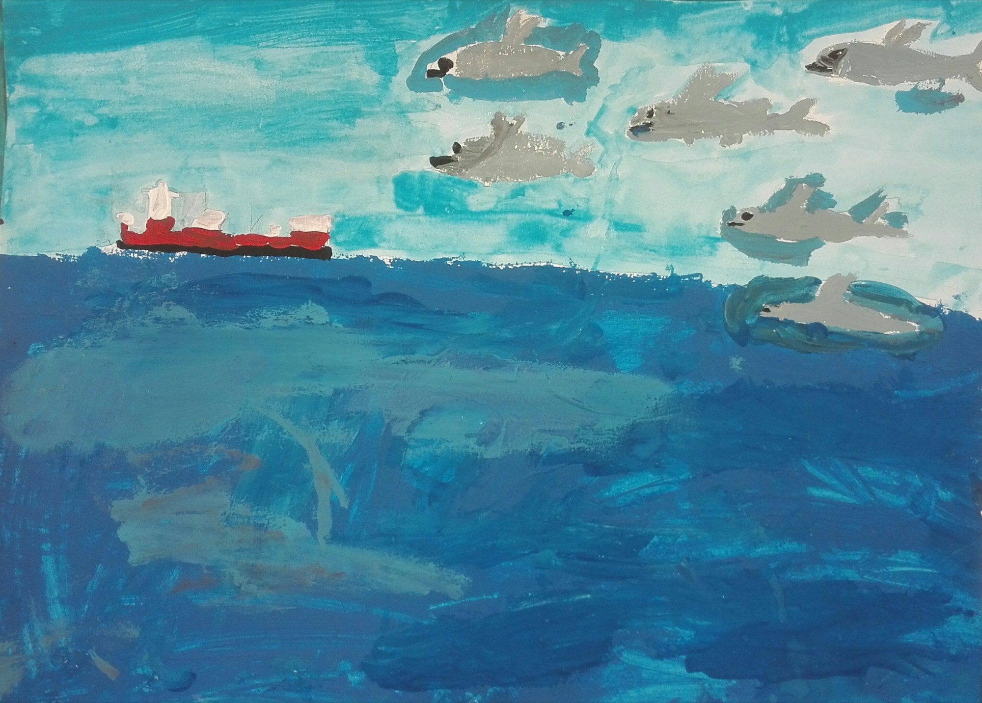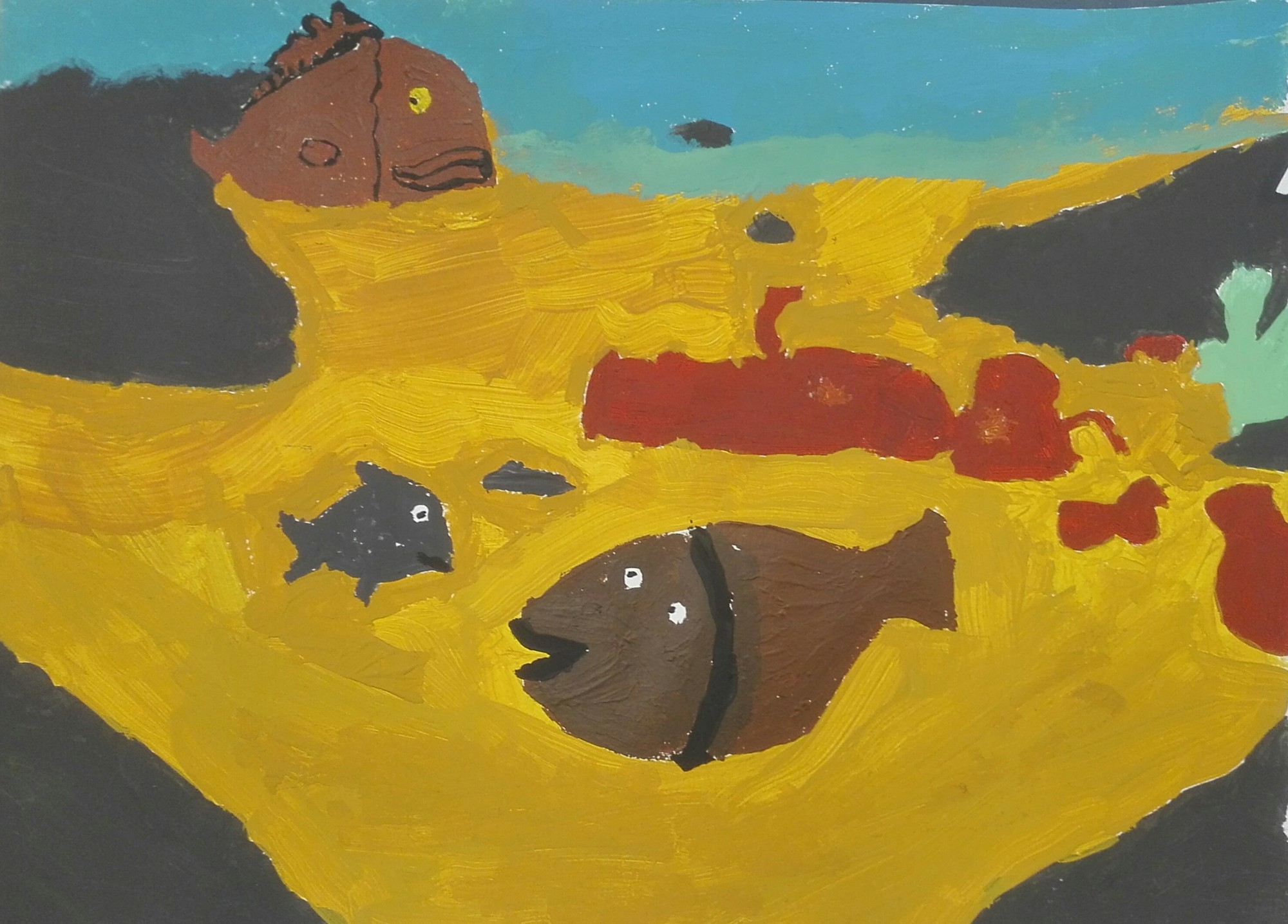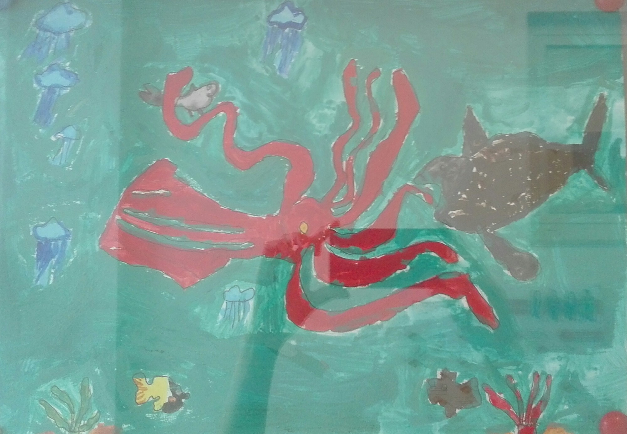 Ein ganz besonderes Projekt nahmen die Schülerinnen und Schüler der 2b in Angriff. Sie illustrierten die Geschichte vom Flunkerfisch (Axel Scheffler und Julia Donaldson). Verwendet wurden Acrylfarben.