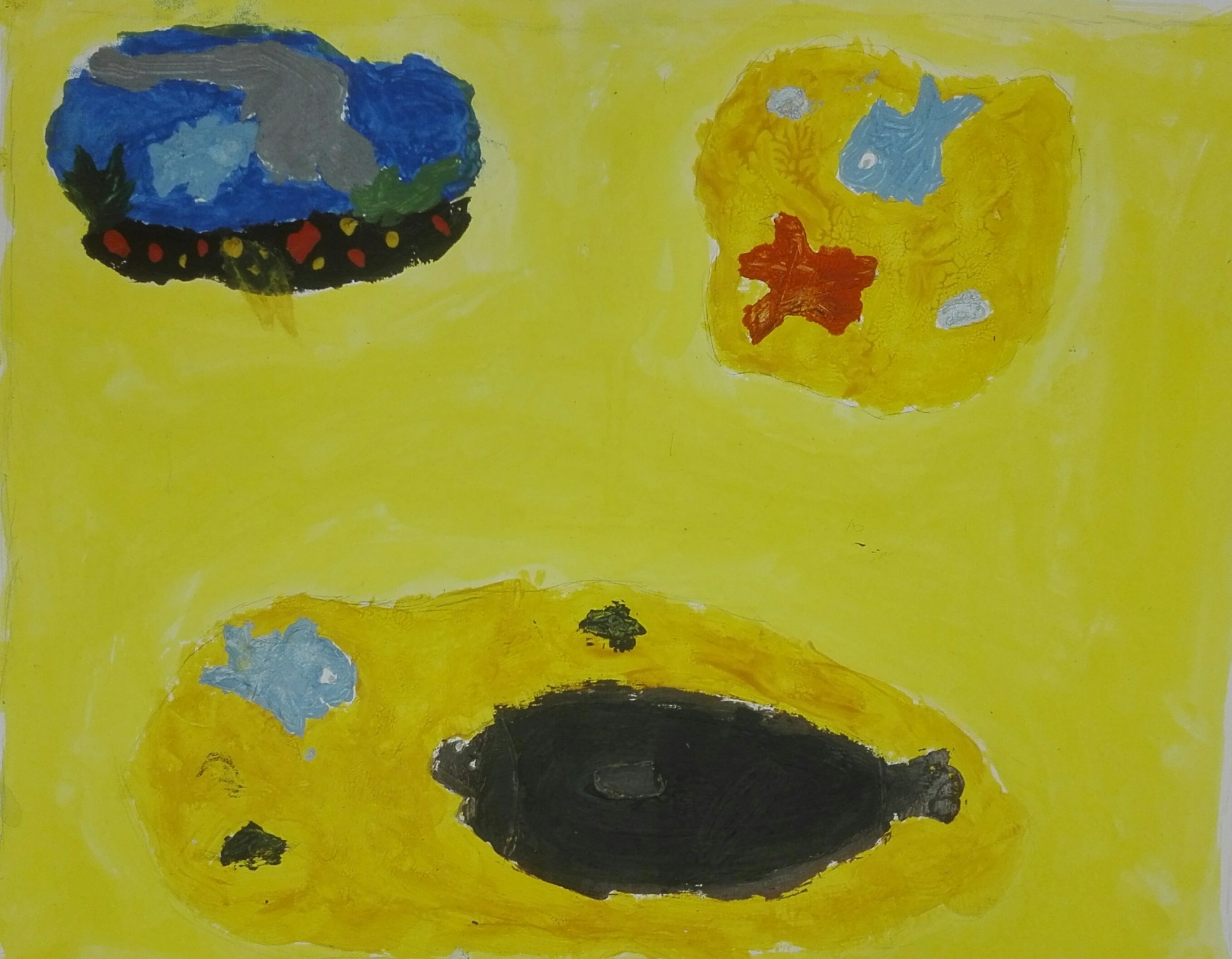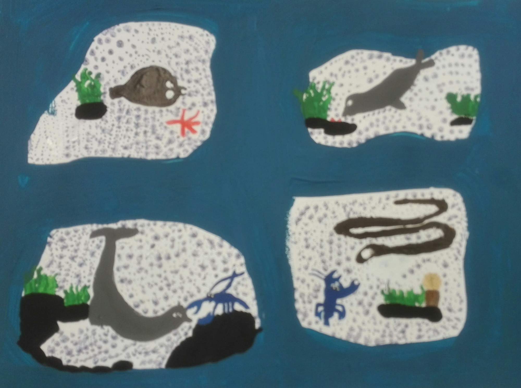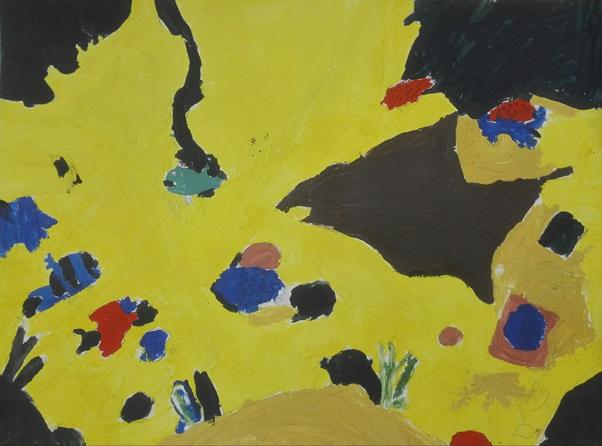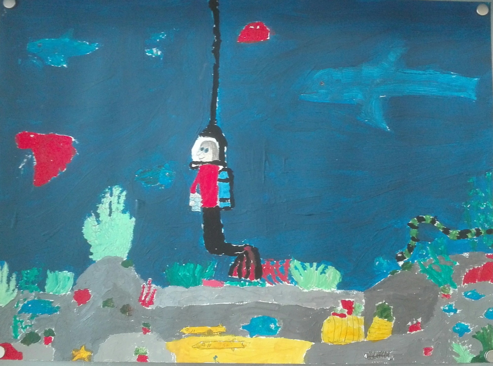 Ein ganz besonderes Projekt nahmen die Schülerinnen und Schüler der 2b in Angriff. Sie illustrierten die Geschichte vom Flunkerfisch (Axel Scheffler und Julia Donaldson). Verwendet wurden Acrylfarben.
